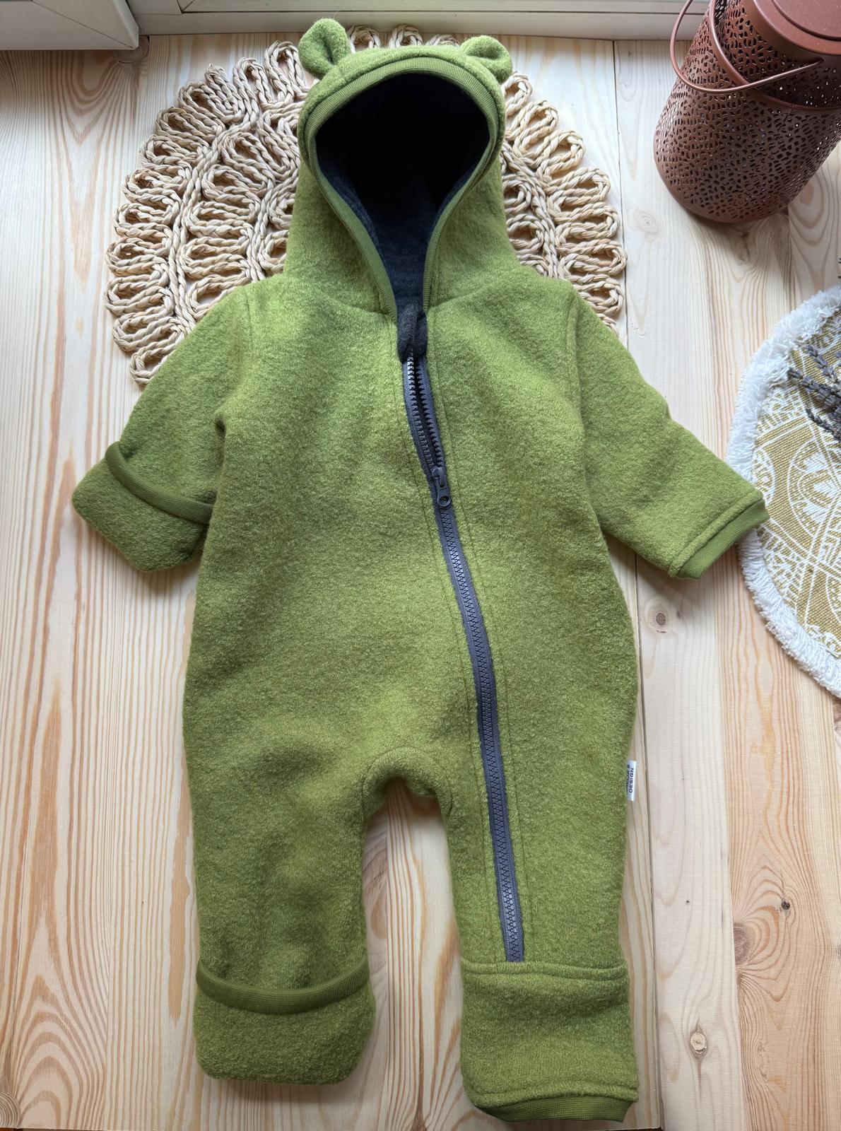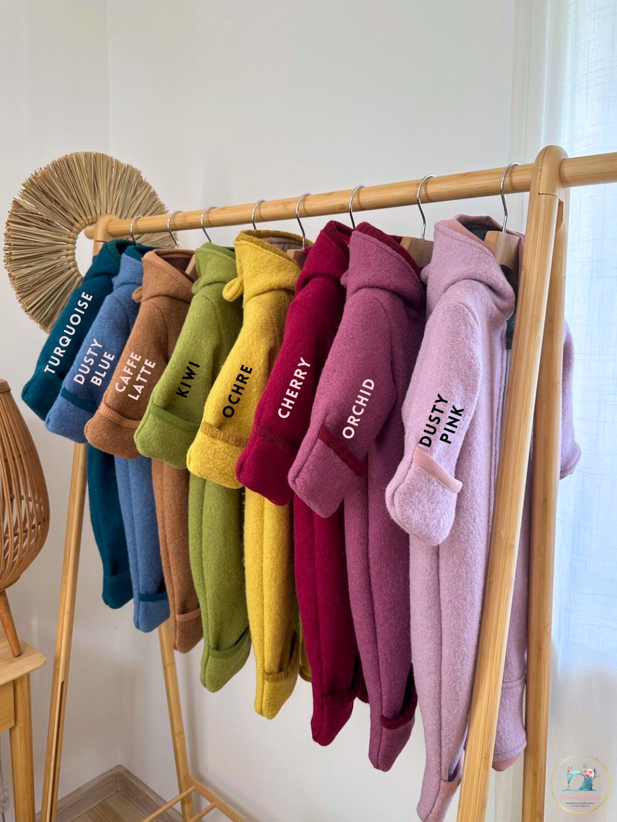 Overall premium din lână fiartă cu interior din merinos moale – protecție naturală împotriva frigului, umezelii și vântului. Dotat cu mănuși și botoși integrați, ușor de întors, pentru confort și flexibilitate în orice sezon. Ideal pentru micii exploratori.
