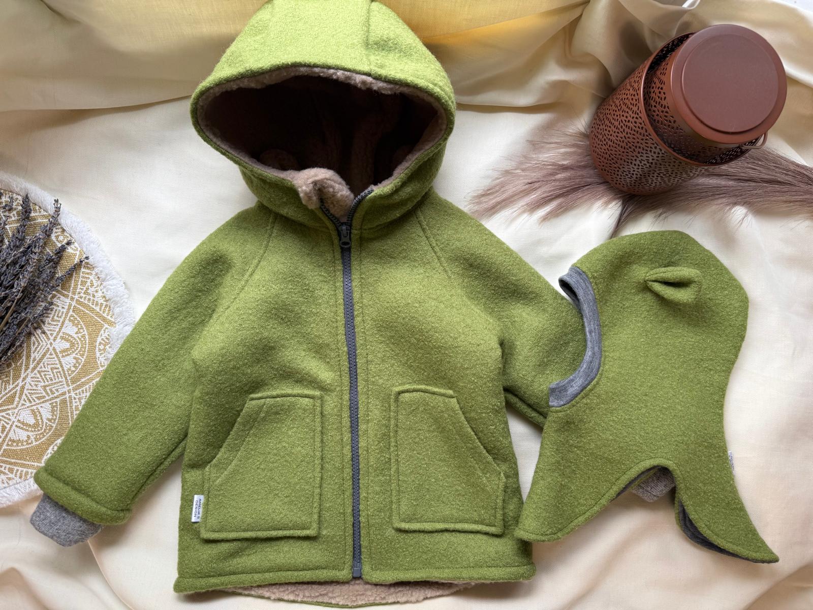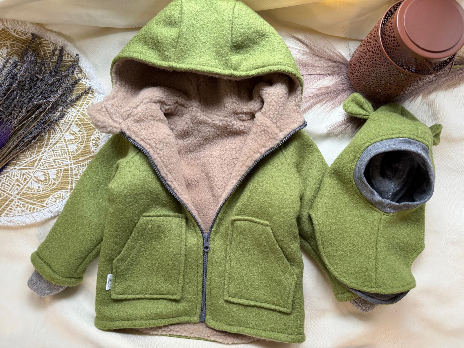 Jachetă este concepută astfel încât să o poți pune direct peste hăinuțele de prim strat purtate în casă (body, bluză subțire, salopetă). Datorită combinăției de lână fiartă + blăniță merino, nu necesită straturi groase dedesubt – copilul rămâne cald fără să fie îmbrăcat excesiv.