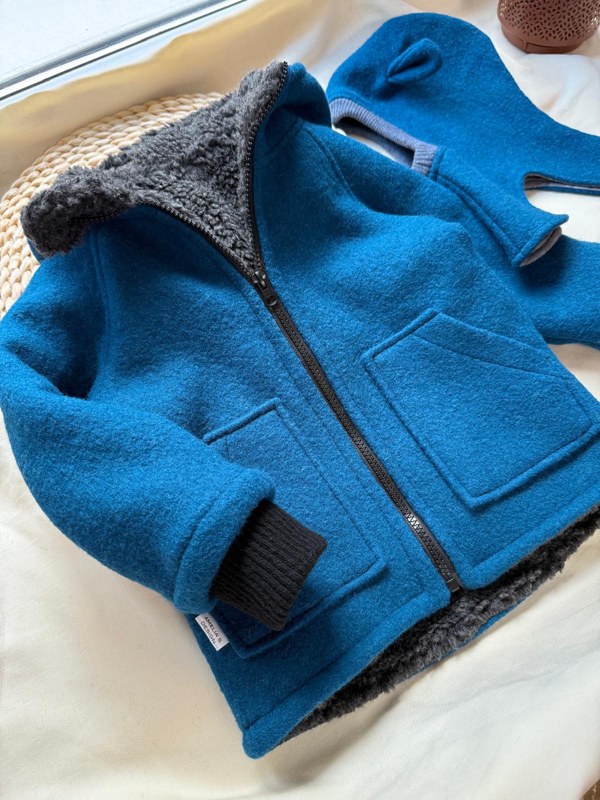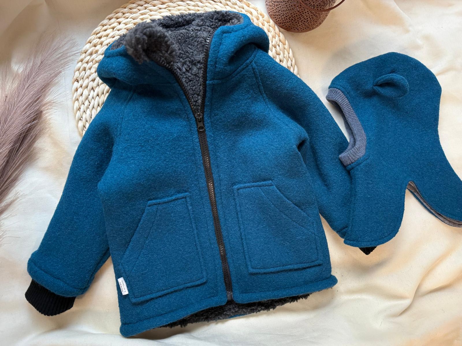 Jachetă este concepută astfel încât să o poți pune direct peste hăinuțele de prim strat purtate în casă (body, bluză subțire, salopetă). Datorită combinăției de lână fiartă + blăniță merino, nu necesită straturi groase dedesubt – copilul rămâne cald fără să fie îmbrăcat excesiv.