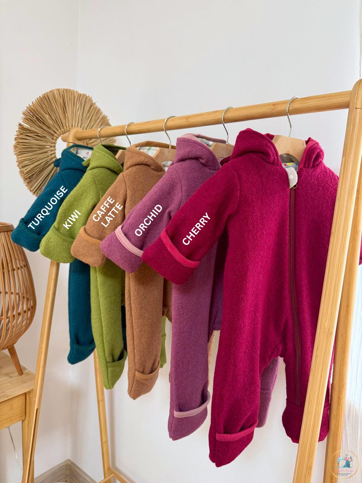 Overall premium din lână fiartă cu interior din merinos moale – protecție naturală împotriva frigului, umezelii și vântului. Dotat cu mănuși și botoși integrați, ușor de întors, pentru confort și flexibilitate în orice sezon. Ideal pentru micii exploratori.