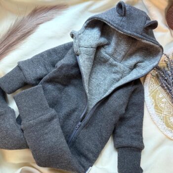 Jacheta este concepută astfel încât să o poți pune direct peste hăinuțele de prim strat purtate în casă (body, bluză subțire, salopetă) la temperaturi peste 8-10 grade.